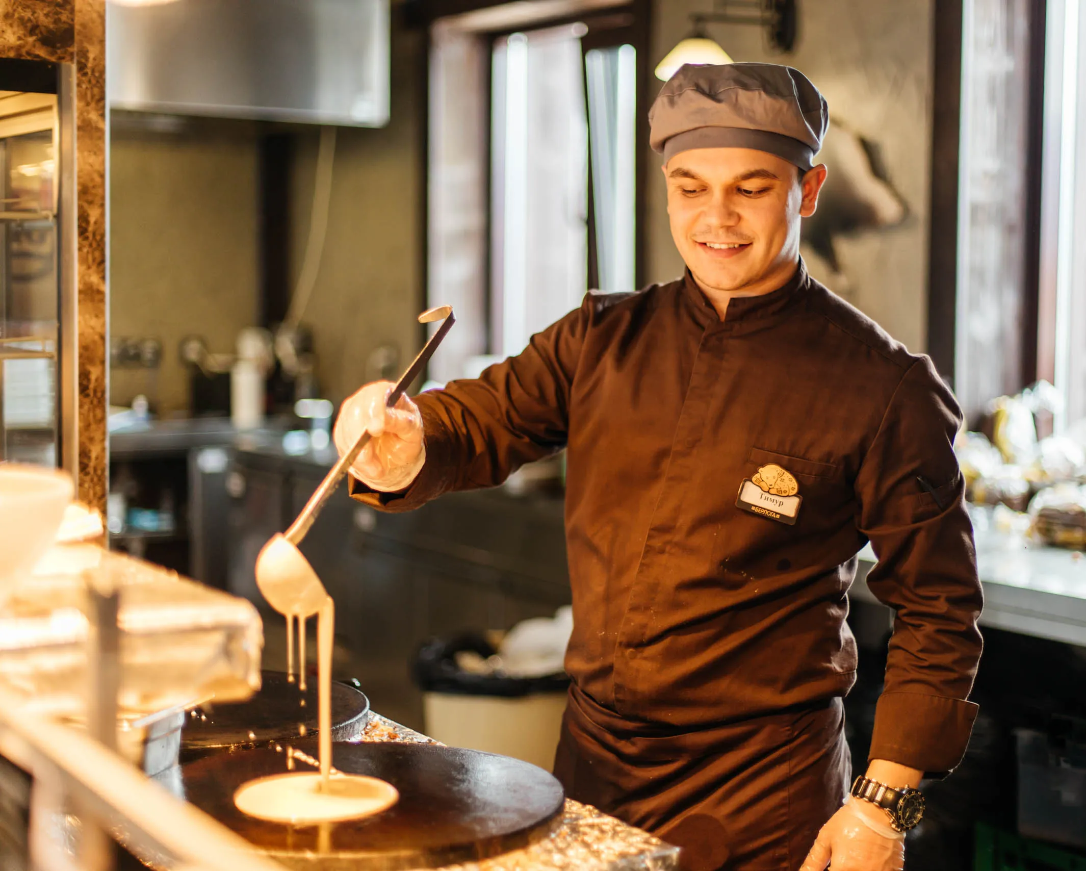 Тонкие домашние на молоке и к ним — начинки на выбор: мед, сгущенка, сметана, варенье.